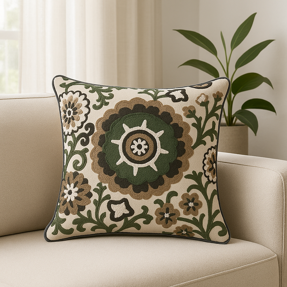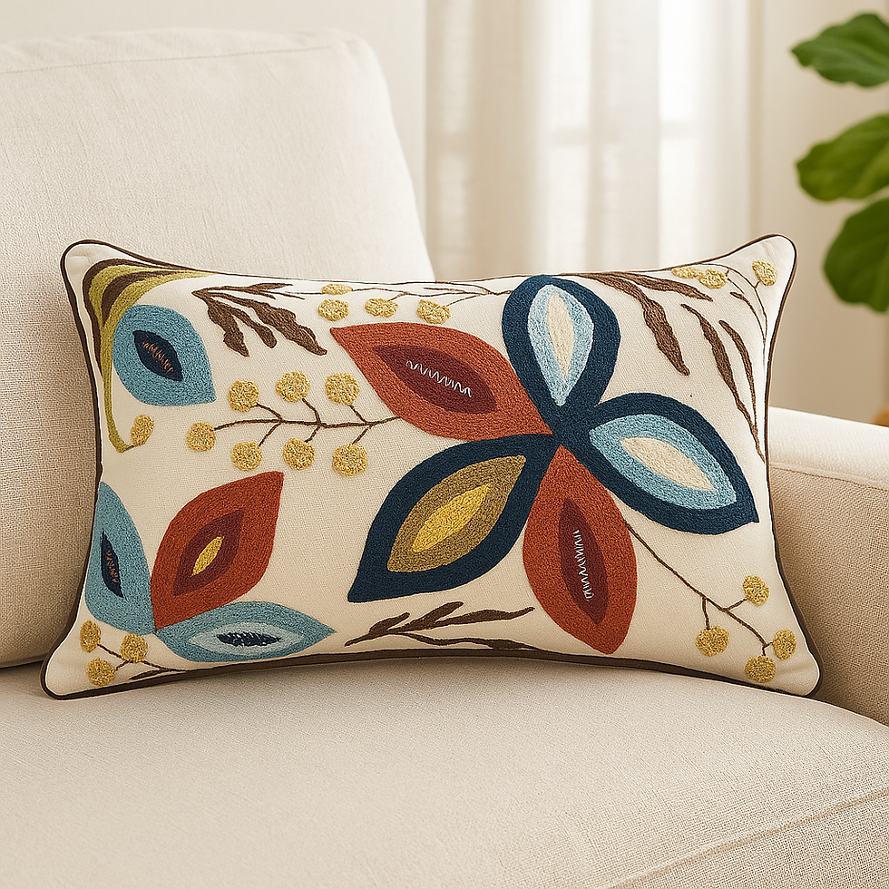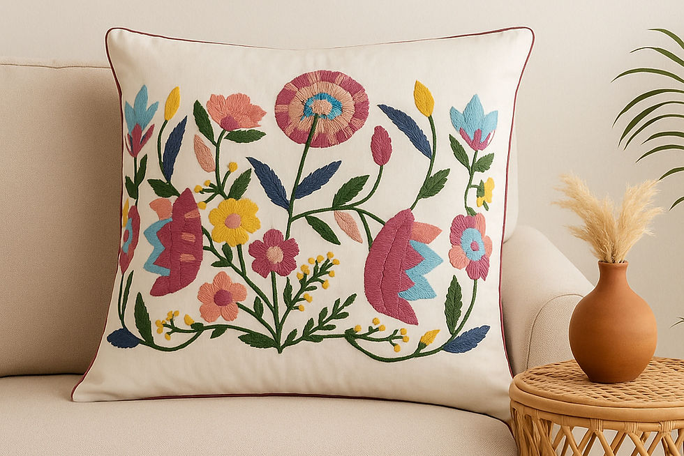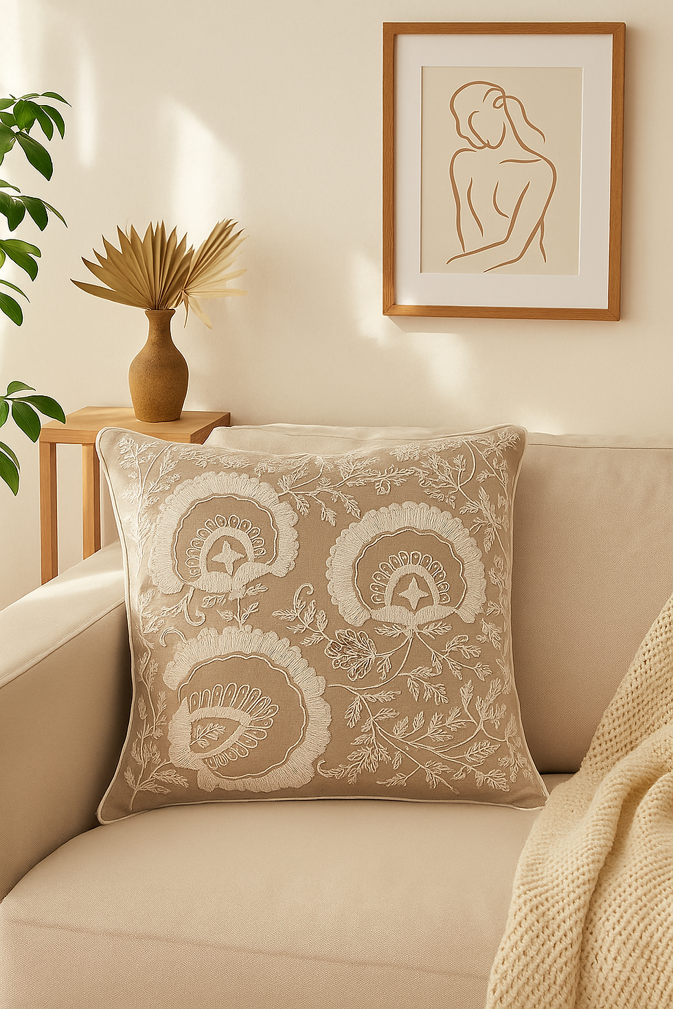 Beige cotton cushion cover beautifully embroidered with rich red blossoms and olive-green vines. Its elegant contrast and timeless floral design make it a refined addition to sofas, lounges, or bedrooms.