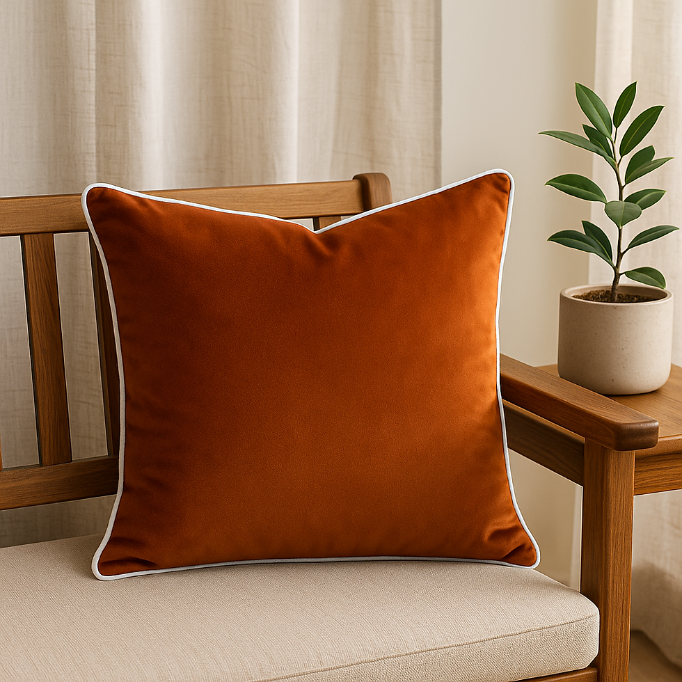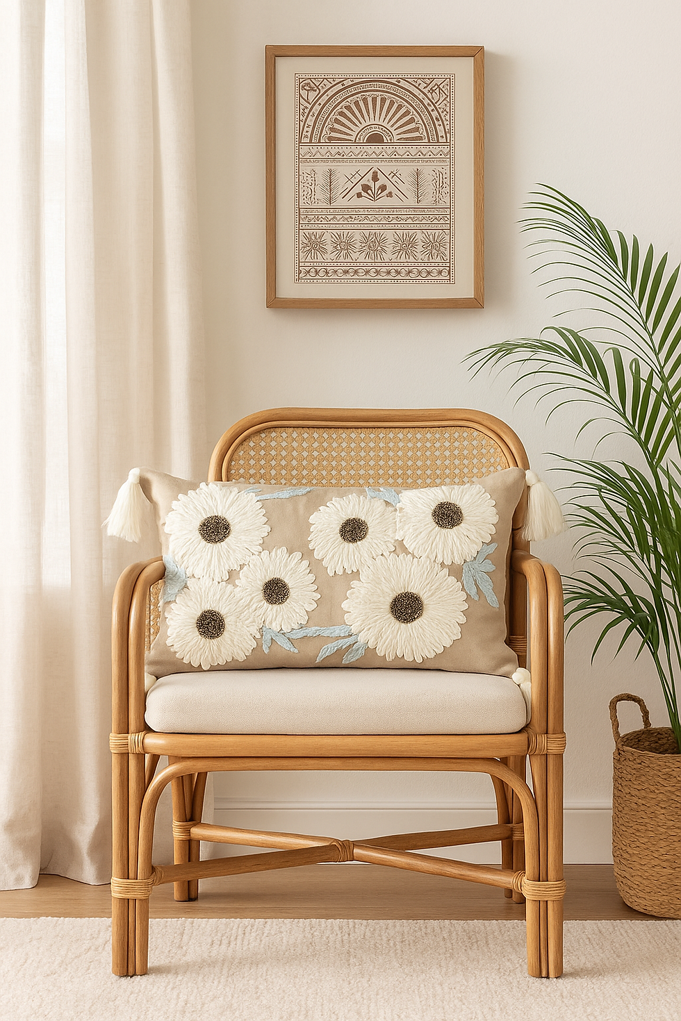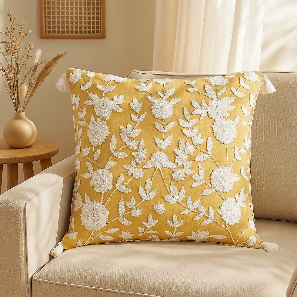 Beige cotton cushion cover beautifully embroidered with rich red blossoms and olive-green vines. Its elegant contrast and timeless floral design make it a refined addition to sofas, lounges, or bedrooms.